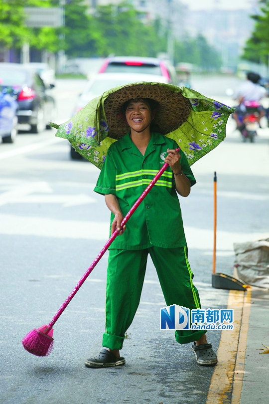 ←炎炎夏日,新桂南路,一位环卫工头戴大草帽工作。南都记者郑俊彬摄(资料图)